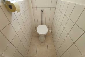 A képeken a földszinti fürdőszoba (kád-, mosdó) és a külön helyiségben lévő illemhely látható.