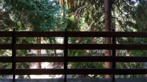 A fenyőfák árnyékot adnak a fedett teraszon tartózkodók részére.
