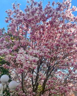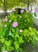 A kertben különféle dísznövények, örökzöldek vannak ültetve: magnólia, boróka, kuszótuja stb.